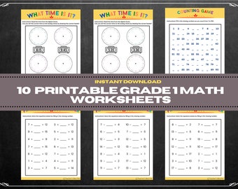 Printable Math Worksheets - 10 Pages of Printable Kindergarten and Grade 1 | Clock | Fill in the Blank | Missing Number | *PDF File ONLY*